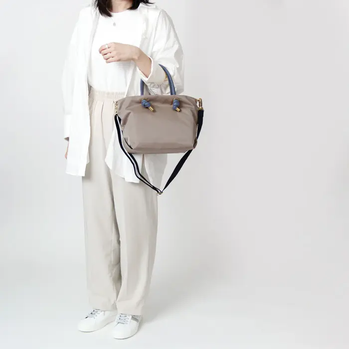 ノット(結び目)がポイントのハンドルはレザー仕立てでナイロンのカジュアル感に上品さをプラスします。ショルダーストラップが付いているので斜めがけもできる2way仕様。お出かけやお子様とのお出かけもにも最適です。ゴールドの金具を使うことで、アクティブな日のカジュアルスタイルも女性らしく仕上げてくれます。