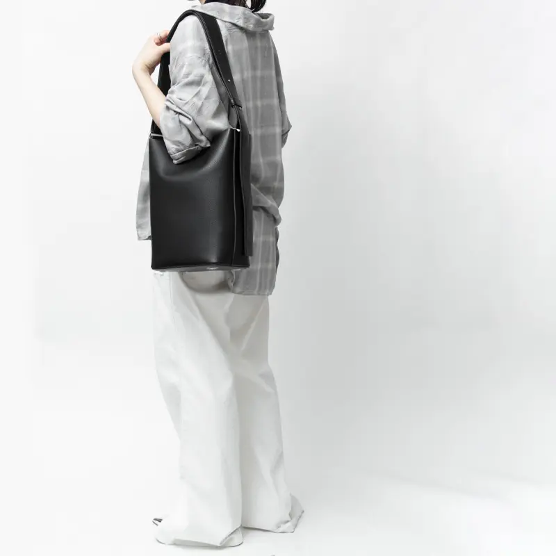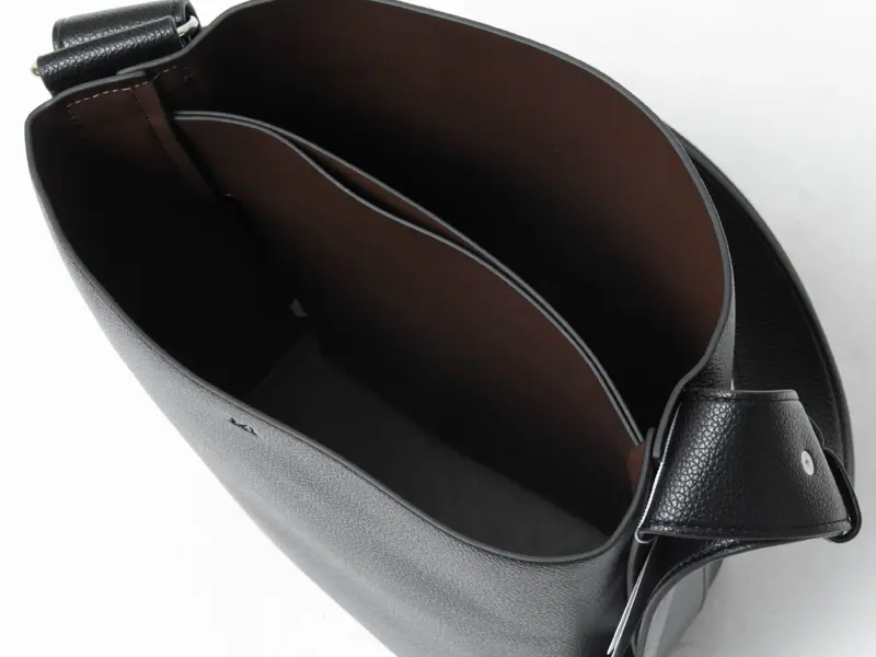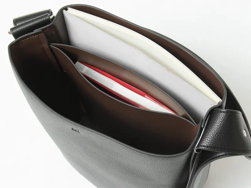 深さのある縦型のショルダーバック。A4が収まるサイズ大きさです。マチ幅が広く、必需品の他、飲み物着替えなども入り、お仕事バッグやマザーズバッグなど様々なシーンで活躍してくれます。中に仕切りにもなるオーポケットが備わっており、B5サイズの手帳なども収納できます。