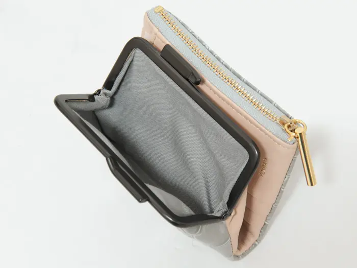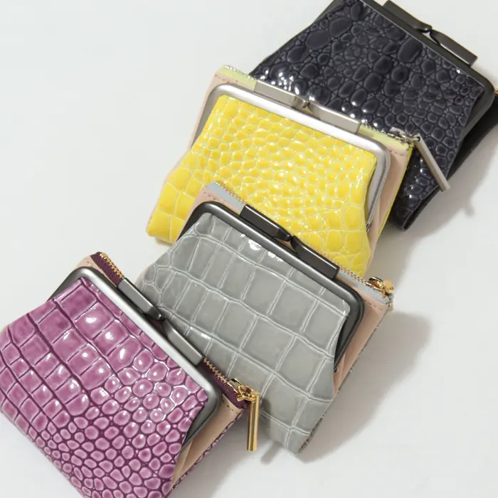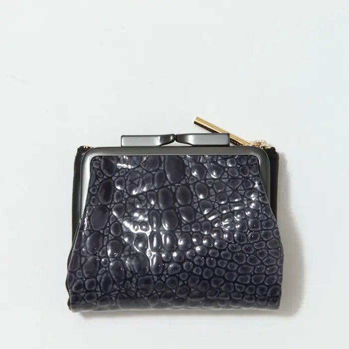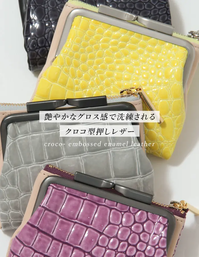 グロス感あふれるエナメルのクロコ型押しレザーで手元華やぐ"POMTATA ポンタタ"のがま口財布。ガマグチとジップポケットが使いやすい2つ折りタイプ。コンパクトながらお金とカードを仕分けて収納でき、デザイン性と使い勝手を兼ね揃えたアイテムです。