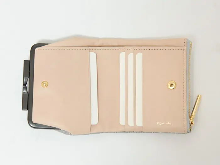 正面はがま口仕様の小銭入れ。小銭がしっかり入り、大きく開くのでスムーズに取り出せます。