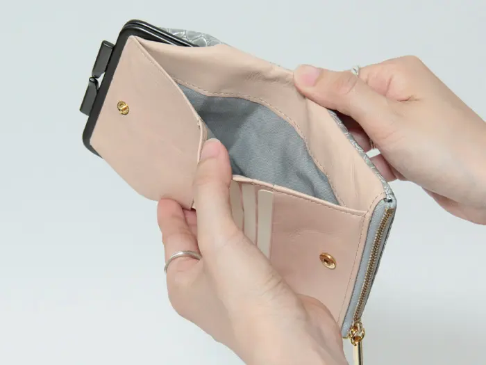背面のファスナーポケットはカードをまとめて入れられます。出番の少ないカードや免許証、保険証の収納に便利です。