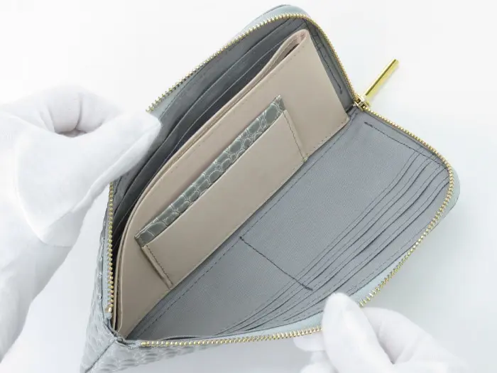 開閉はL字ファスナーデザイン。お札、小銭、カード収納14ヵ所、オープンポケットとすべてが一目瞭然なのが、このお財布の最大の魅力。L字ファスナーでアクションが一度で済み、開閉もしっかり開きます。財布の中身が見やすく取り出しやすいので、支払いがとてもスムーズに行えます。