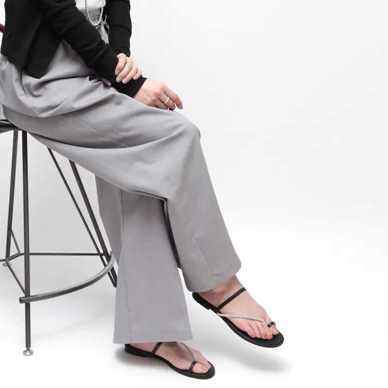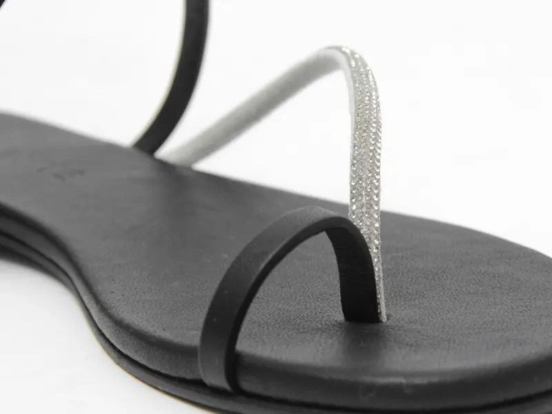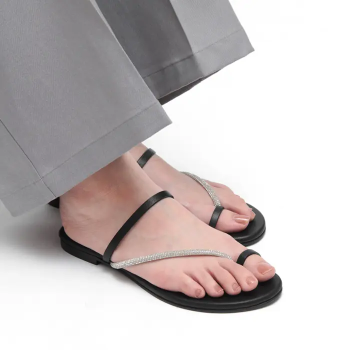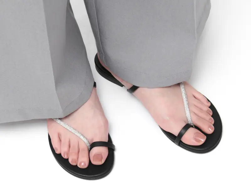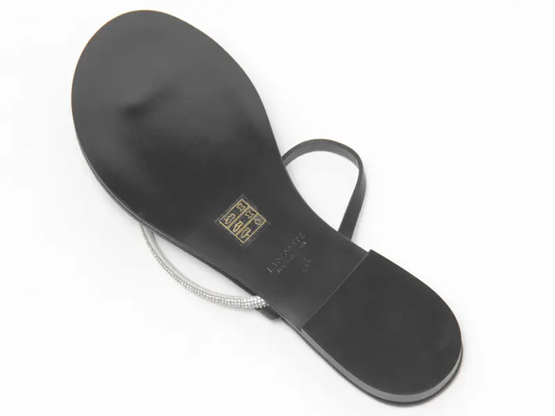 黒を引き立て、肌を美しく魅せるラインストーンがシックで高級感を演出し、コーディネートを格上げしてくれる一足。かかとのストラップが無いデザインですがアッパーと親指のベルトで足をしっかりホールドしてくれます。