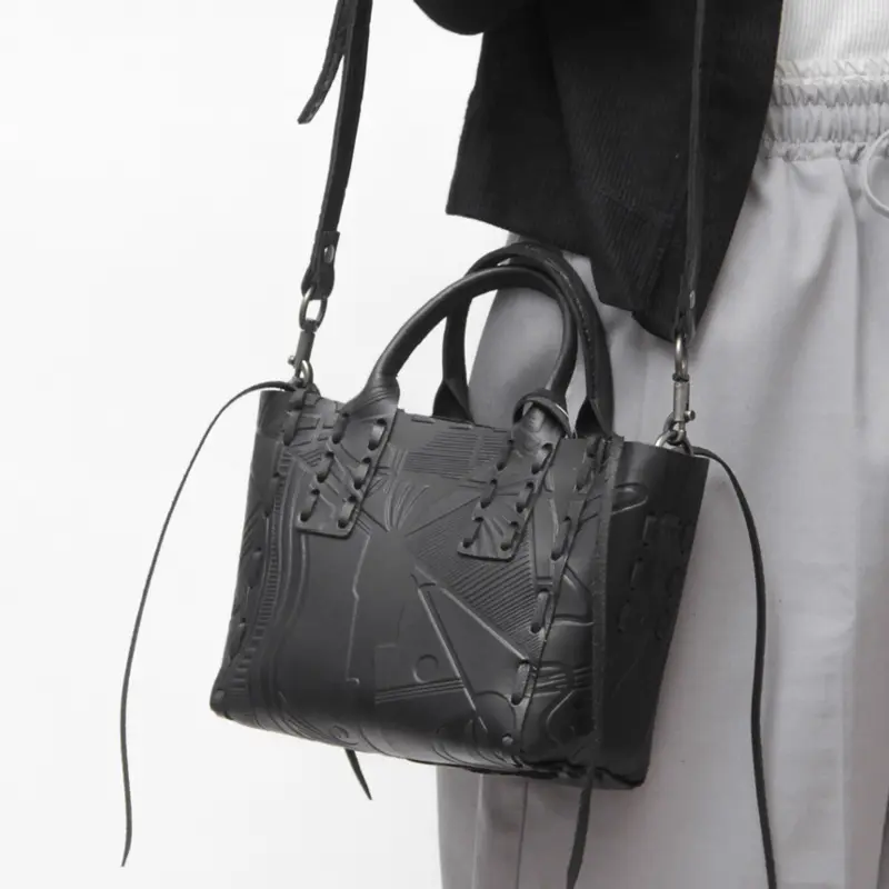 アクセントを効かせたクラフト調の編み込みディテールが魅力。両サイドのレザーコードが揺れ動き、バッグにさりげない表情と個性をプラスしてくれます。