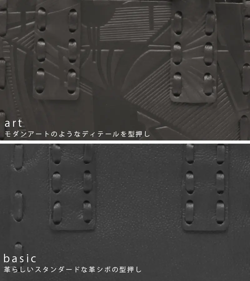 素材は型押しを施した牛革。同色で2種類の型押しバリエーションがあります。それぞれ違った雰囲気があり、魅力的な仕上がりです。