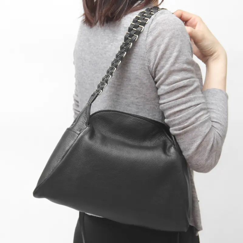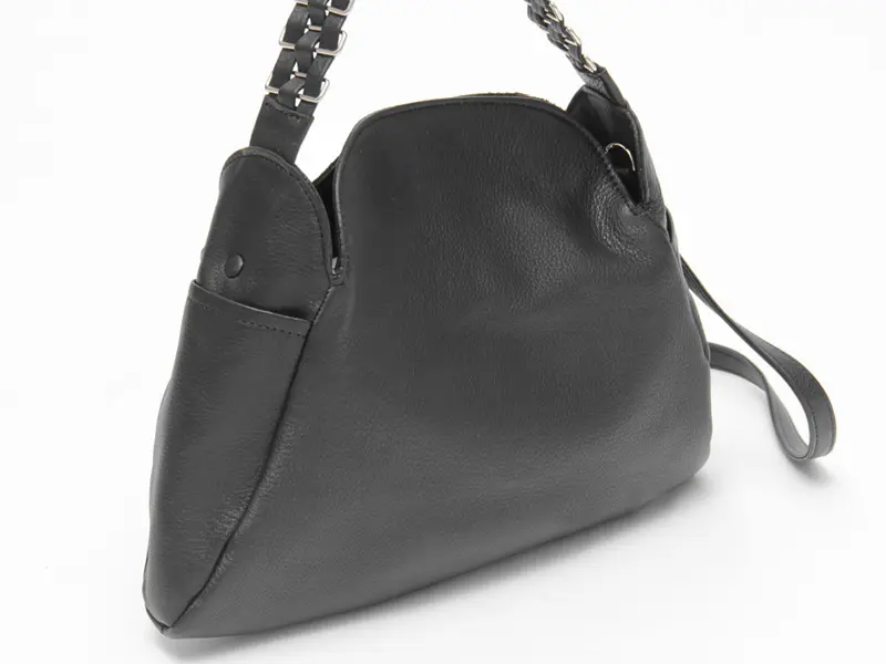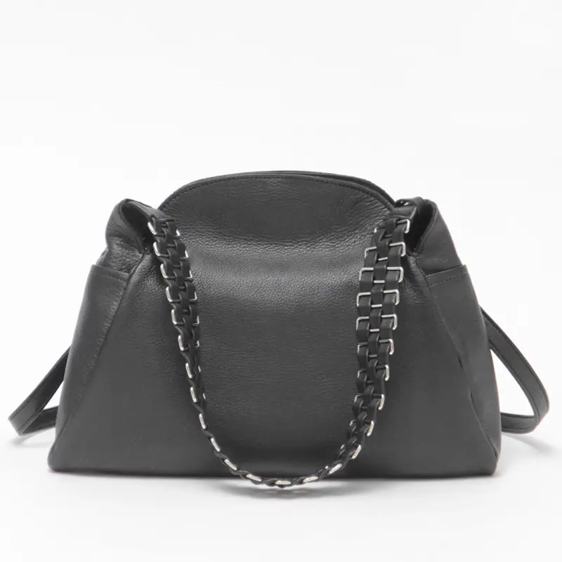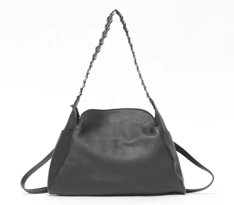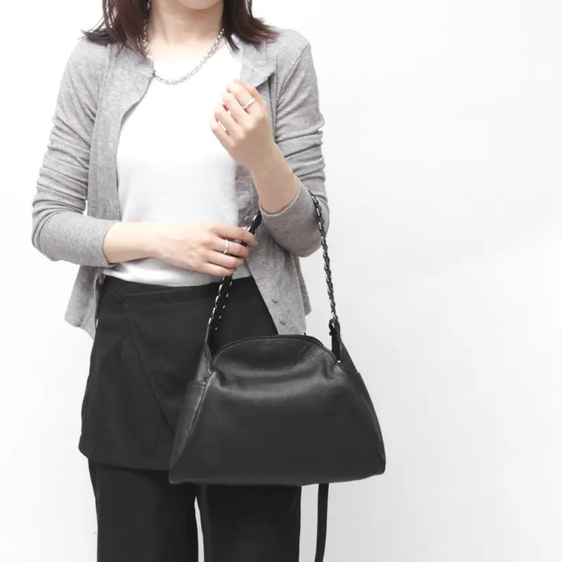 柔らかいレザーにメタルチェーン風ディテールのハンドルが、シンプルながらも印象的で、スタイリングに華やかさをプラスしてくれます。クラシカルなシルエットにモードなアクセントを添え、オフィスにもカジュアルにも溶け込み装いにさりげない品格をプラスしてくれます。