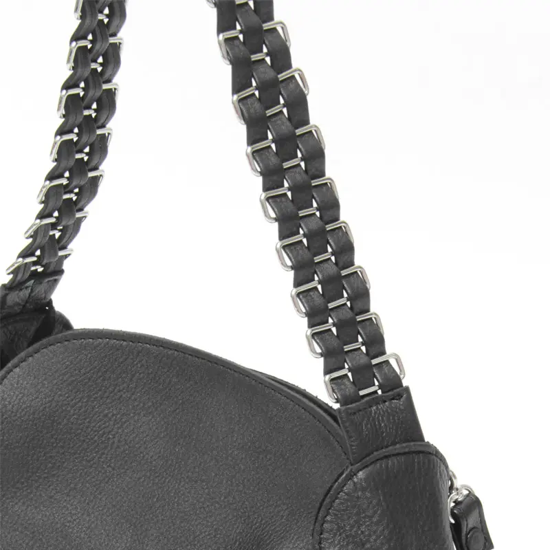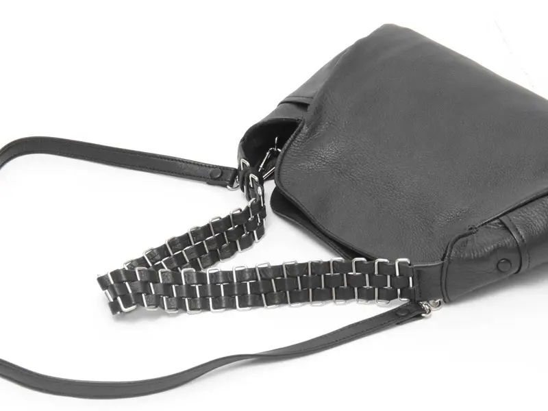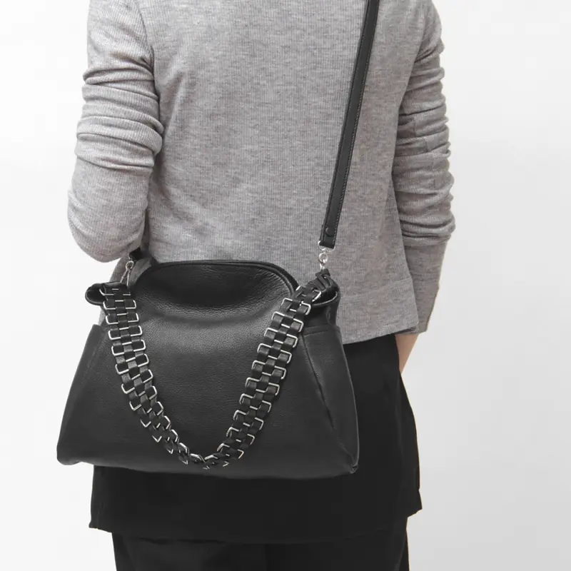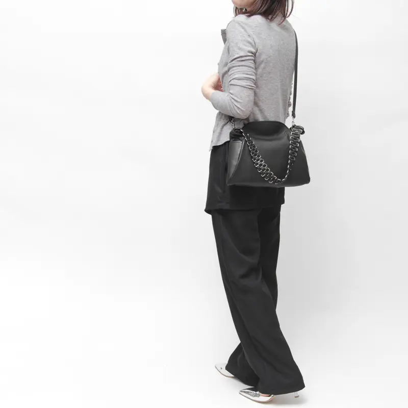 レザーにメタル金具をいくつも繋げたハンドルは太すぎない絶妙な幅で、肩掛けしやすくハンドでも持ちやすい設計。クロスボディにした際も、美しく垂れ下がるシルエットがバッグのアクセントに。