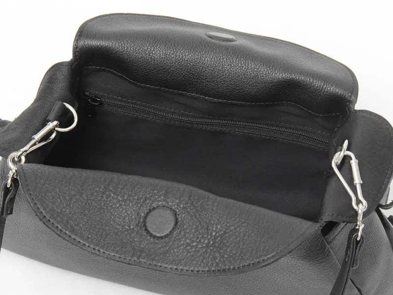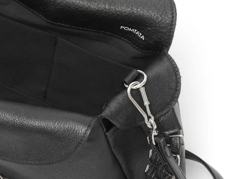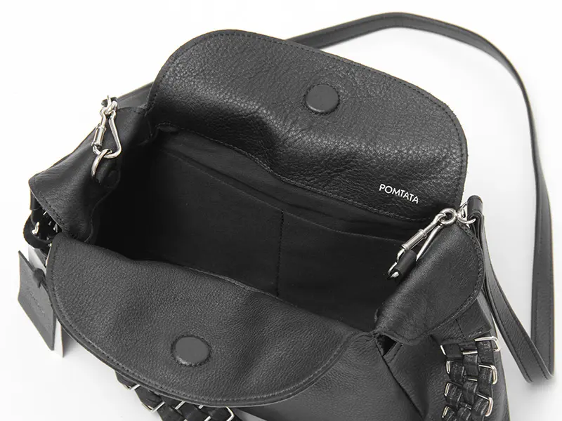ストラップの付け根は開閉口の内側に配置。フラップの隙間からさりげなく覗く仕様で、装いを邪魔しないスマートなデザインです。