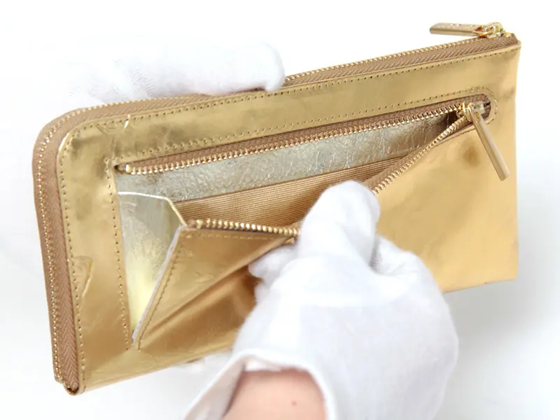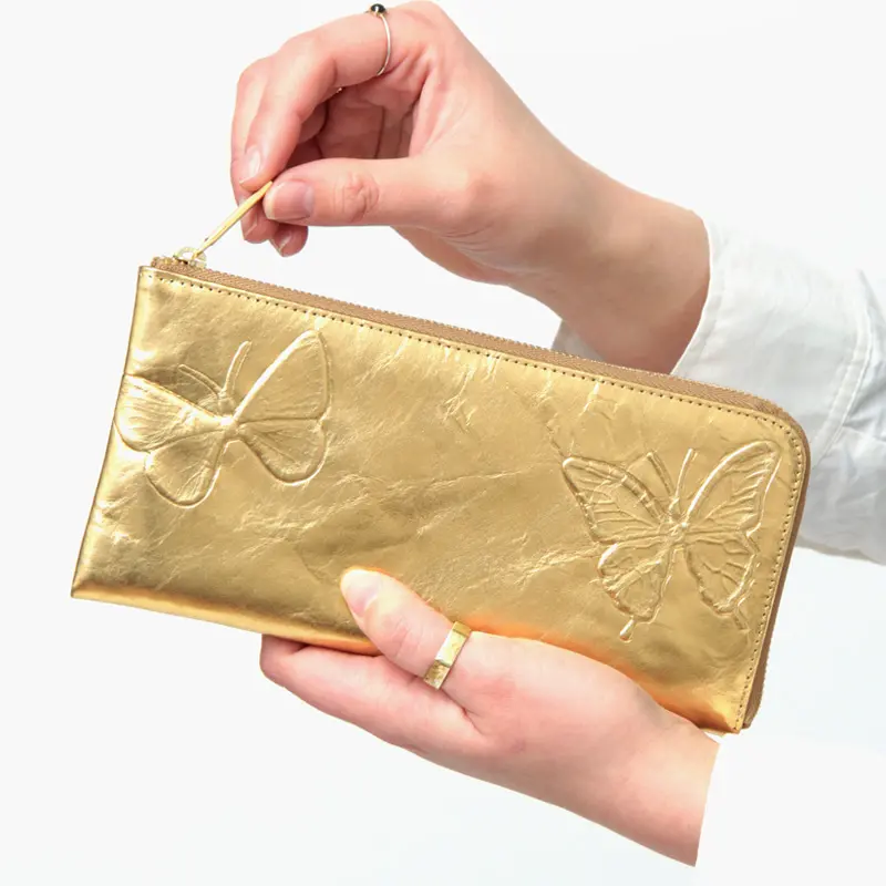"VIA DOAN ヴィアドアン"のロングセラーのドルチェシリーズに、20周年限定カラーの"DOLCE SHINE ドルチェシャイン"が登場。さまざまな蝶の型押しが施され、一点ごとに異なる唯一無二のデザインが魅力のお財布です。見た目の華やかさだけでなく、オールゴールドで金運アップも期待できる縁起の良いサイフです。使い勝手の良さが魅力のL字ファスナー長財布は、収納力がありながらも機能的でスマートに持てる人気のデザインです。