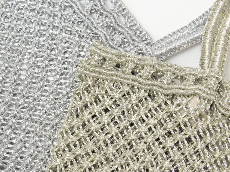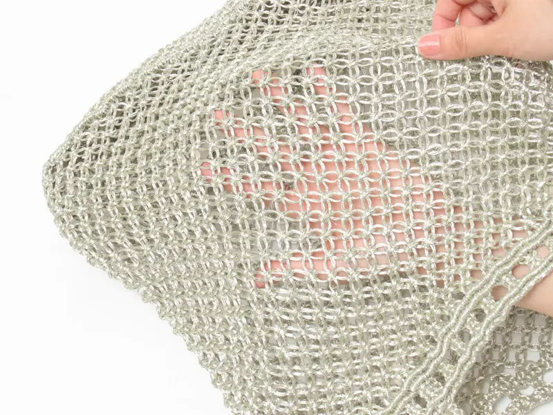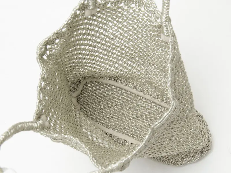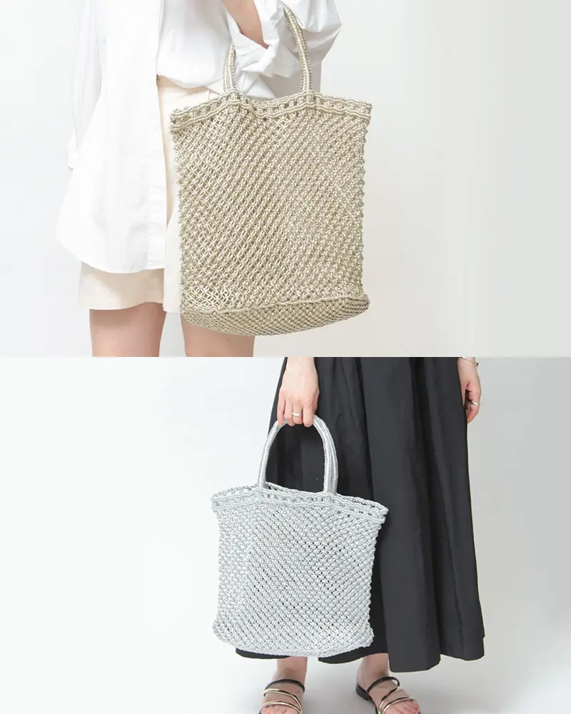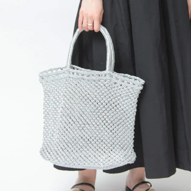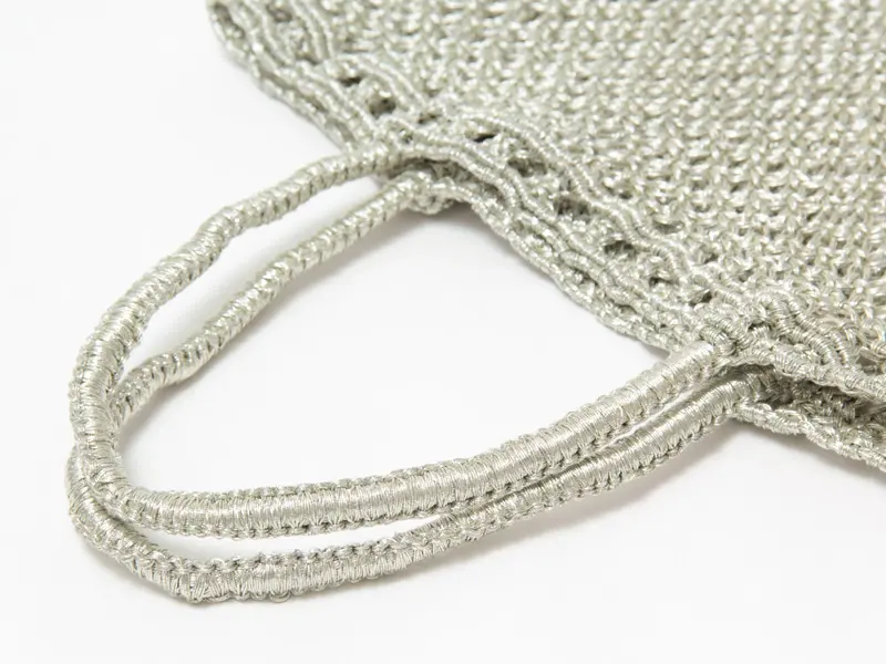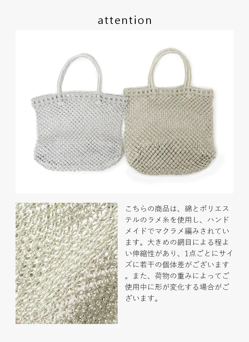 きらりと光るメタリックコードで編み上げたマクラメバッグ。編み模様の立体感と輝きがシンプルなコーデにも抜け感をエッジをプラスし、感度の高い存在感を放ちます。ほどよい柔らかさを伸縮性があり、持ち心地も軽やかです。