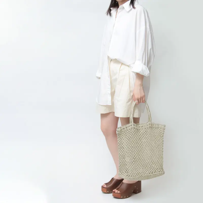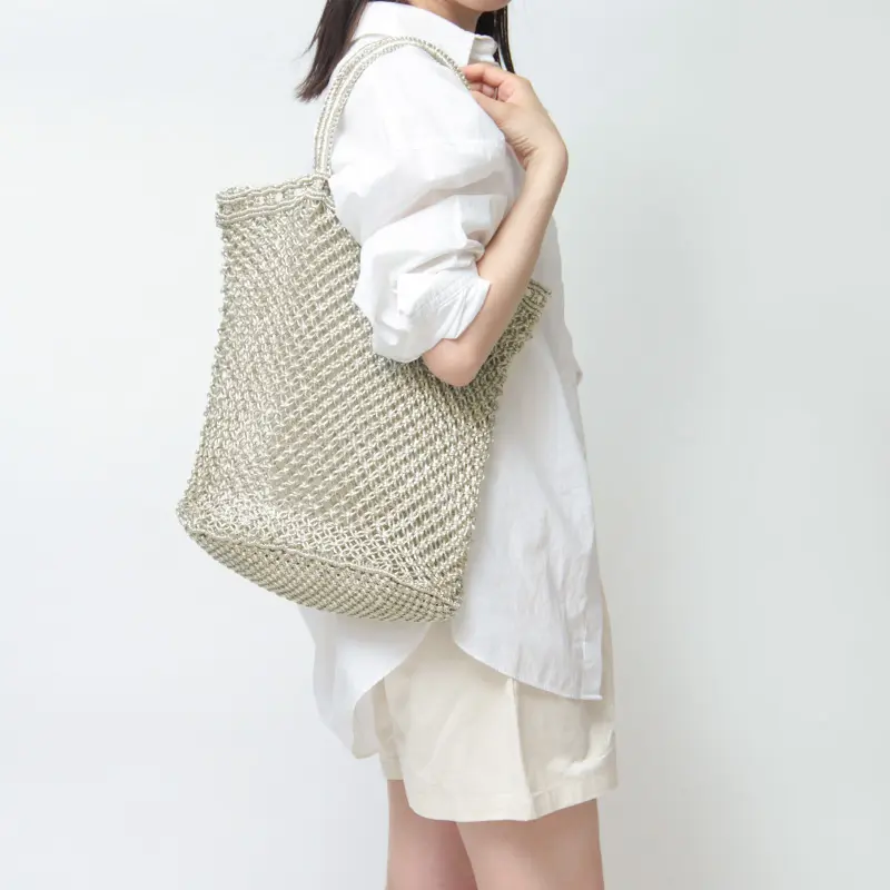 キラリと光るマクラメ編みの表情が魅力の、The Bagmati(バグマティ)のマクラメバッグ。シンプルなトート型で、メッシュ状の編み地が軽やかな印象を演出します。必需品がゆったり収まるサイズ感で、夏のシンプルコーデにこそ合わせたいひと品です。