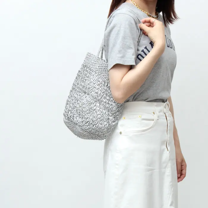 マクラメ編みの表情が可愛い"TheBagmati バグマティ"のトートバッグ。ハンドクラフトで仕立てられた上品なメタリックカラーのメッシュ素材が季節感を演出します。お出かけの必需品が収まる使い勝手のいいサイズで肩がけできる長めのハンドルで使い勝手抜群。どんな装いにも映える洗練されたデザインがブラッシュアップしてくれます。