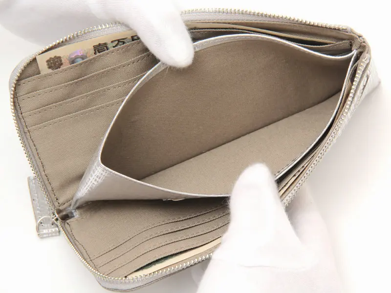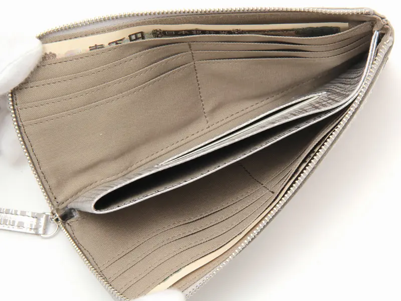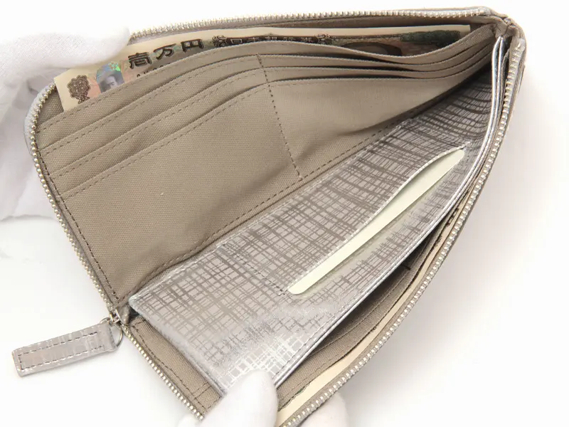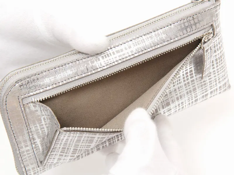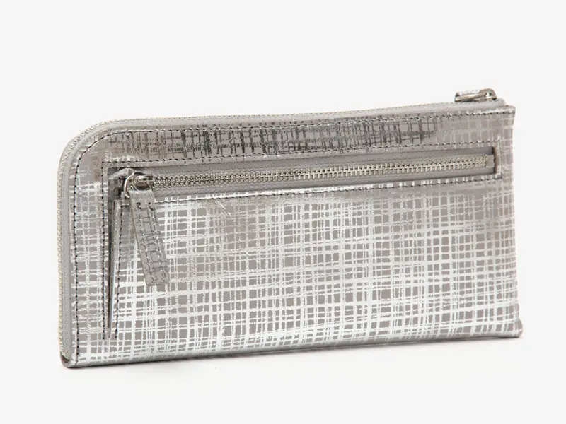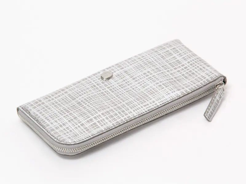 繊細なネットチェック柄を箔プリントしたオリジナルレザーを使用したL字型長財布。ファスナーを開くと中身が一目で見渡せ、カード・小銭・お札へのアクセスがスムーズ。小銭入れはあえて開閉なしの設計で、動作もスマートに。薄型ながら収納力があり、使い勝手も抜群です。