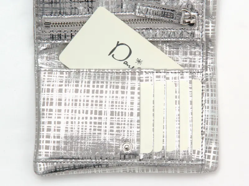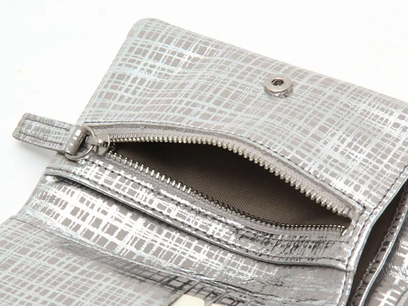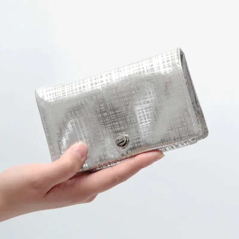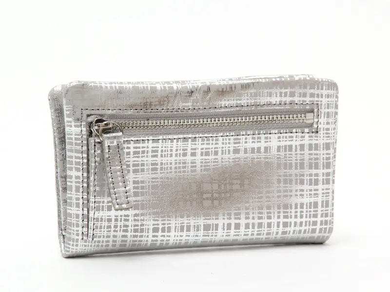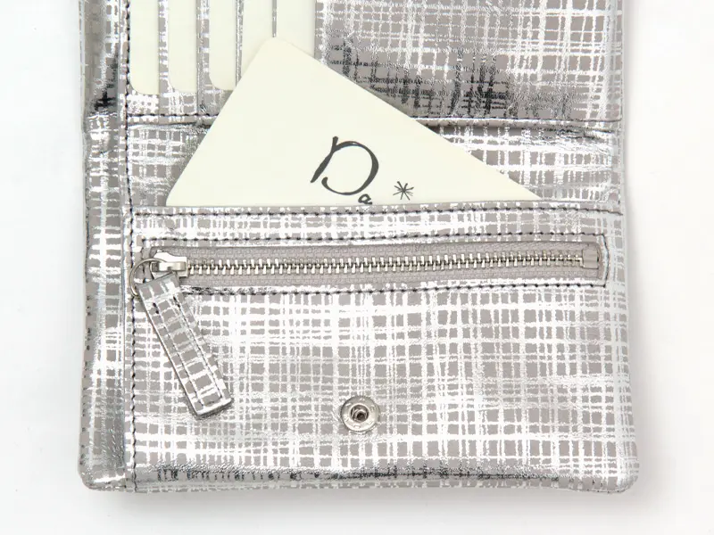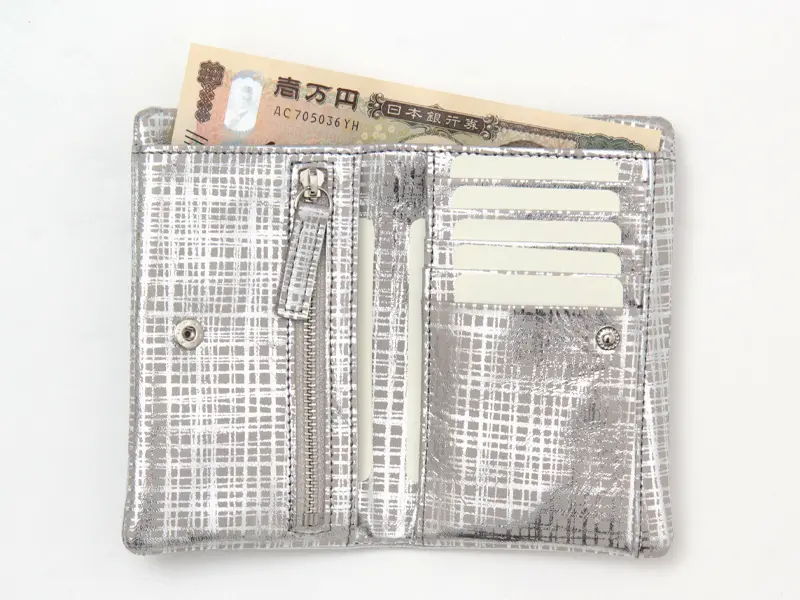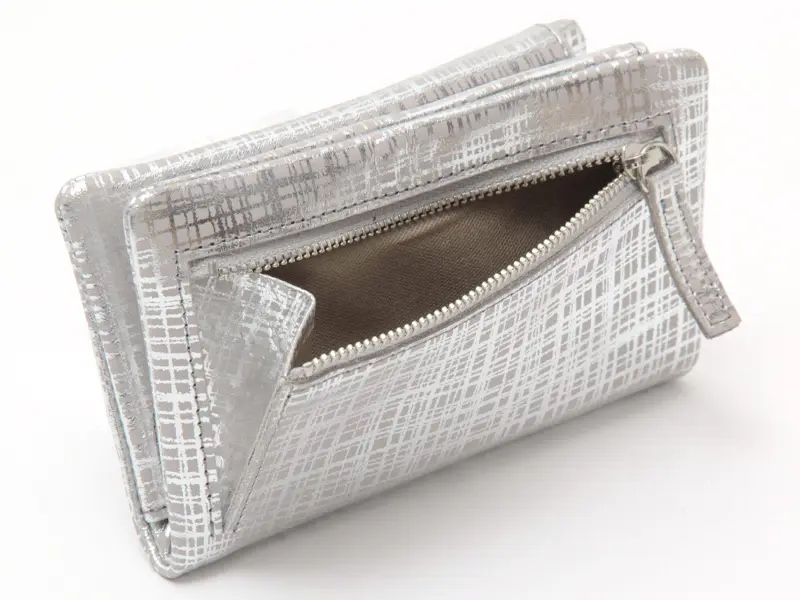 牛革にネットチェック柄の箔プリントを施したオリジナル素材を使用。手元華やぎ、お会計の度に気分も上がりそう。表に縫い目を出さない仕様も新鮮なお財布です。