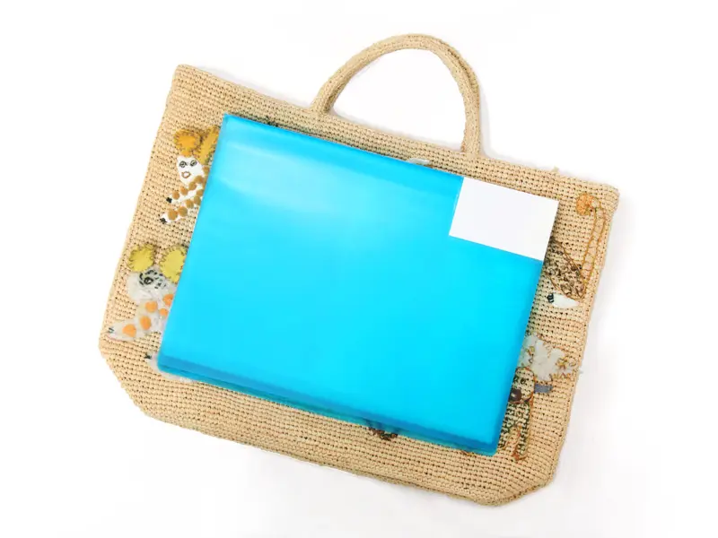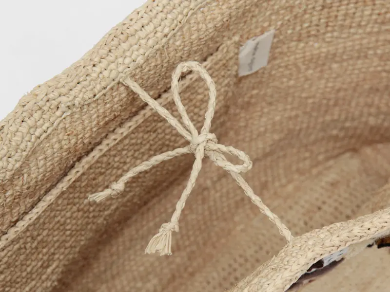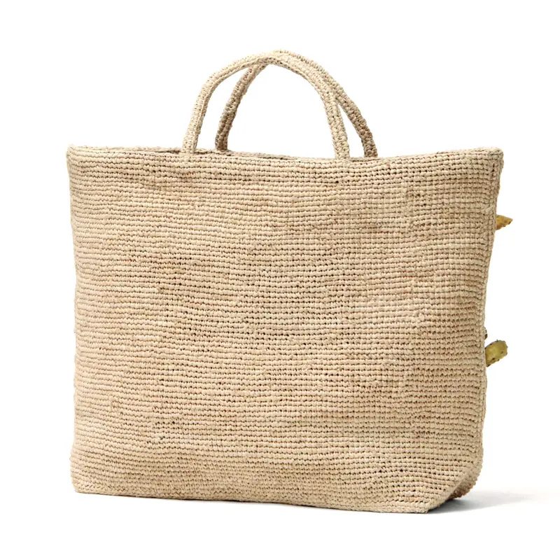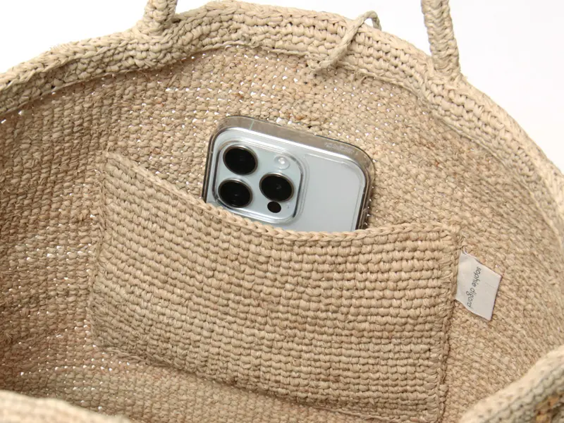 開閉はラフィアの紐を結ぶ仕様です。A4サイズがゆったり収まるちょっと大きめのトートバッグ。長財布やポーチはもちろん、夏の必需品、折りたたみの日傘や飲み物も入れていただけます。内ポケット付きなので、スマホやICカードなどの小物も整理して収納できます。収納力がしっかりあるので、夏のデイリーバッグや通勤バッグにおすすめです。