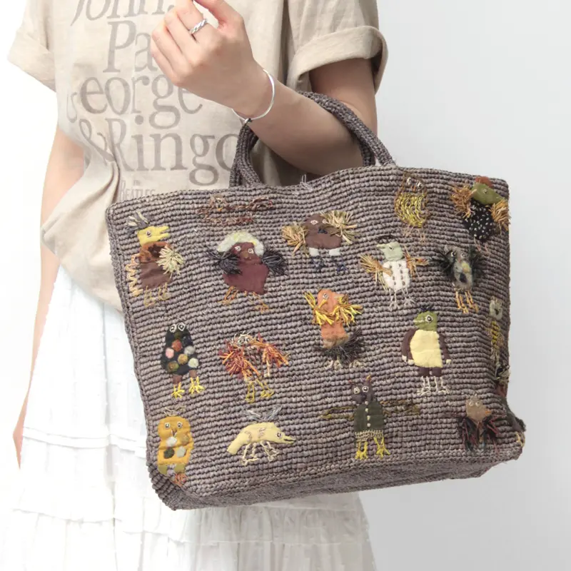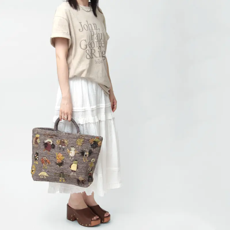個性豊かな鳥たちの刺繍が目を惹く"ソフィーディガール Sophie Digard"のラフィアバッグ。ひとつとして同じ表情のない手刺繍は、それぞれに異なる表情や模様、細かな足元まで丁寧に表現され、作り手のこだわりが伝わってきます。A4サイズがゆったりと収まる大きめのサイズ感でたっぷり荷物が収まります。繊細な色使いが上品に映える、まるでアートのような存在感。その佇まいは、夏の装いにさりげない華やかさを添え、ワンランク上のコーディネートへと導いてくれます。