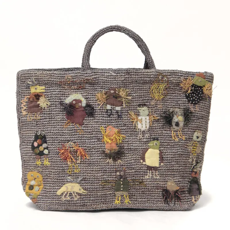 かぎ編みのラフィアにユーモラスで愛らしい小さな鳥たちが並んだモチーフが施されたスクエア型のかごバッグ。落ち着いたトーンの配色が、遊び心の中にも大人の上品さを感じさせてくれます。短めのハンドルは腕に掛けたり、手持ちでバランスよくお持ちいただけます。