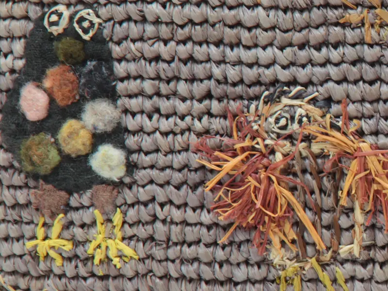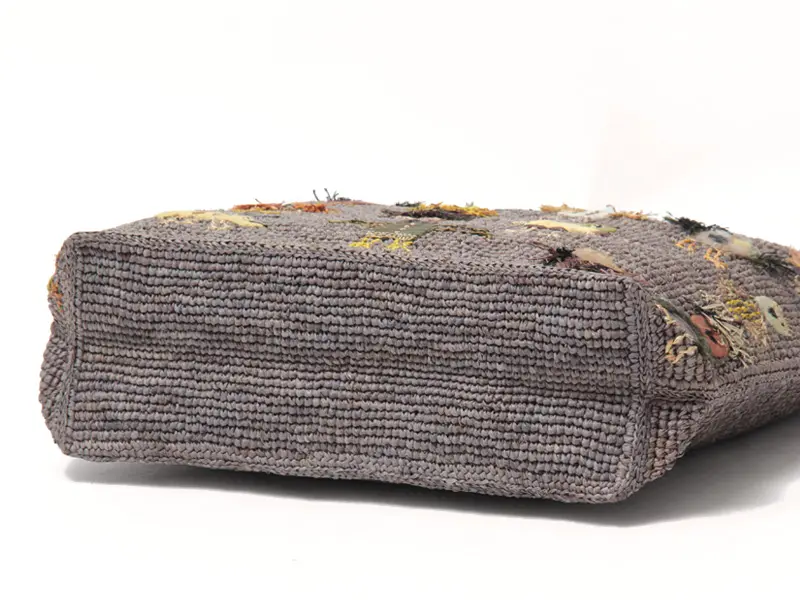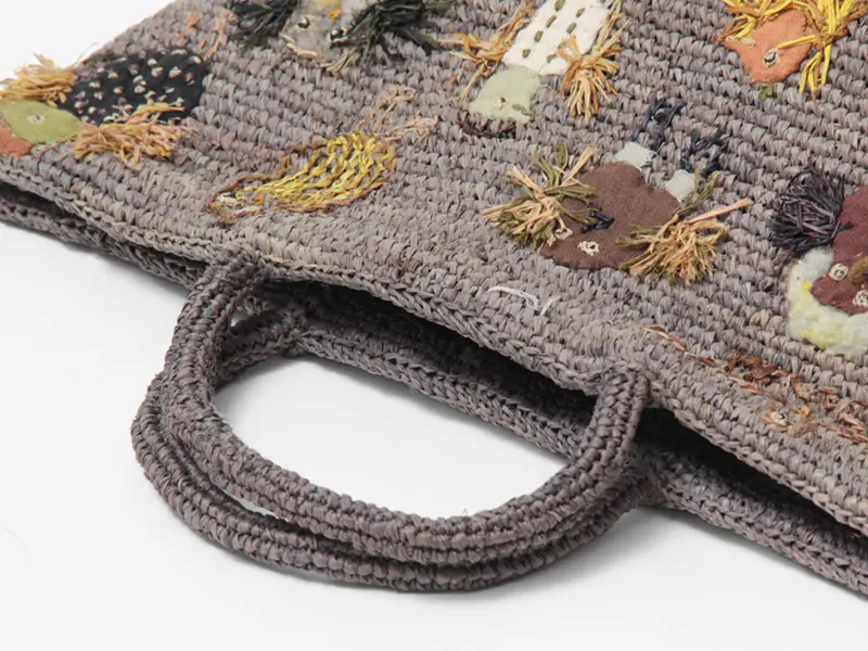 ラフィアを丁寧に編んだハンドメイドの温もり感じるカゴバッグ。正面・背面・底面の境目、ハンドル、裏面に至るまで継ぎ目を感じさせない網目の美しさ。刺繍はラフィア、ガーゼ、羊毛などを使い、立体感も演出。同じデザインでもひとつとして同じものがない手作業による芸術的な逸品です。