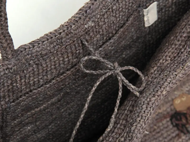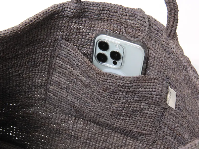 開閉はラフィアの紐を結ぶ仕様です。A4サイズがゆったり収まるちょっと大きめのトートバッグ。長財布やポーチはもちろん、夏の必需品、折りたたみの日傘や飲み物も入れていただけます。内ポケット付きなので、スマホやICカードなどの小物も整理して収納できます。収納力がしっかりあるので、夏のお出かけや通勤バッグにおすすめです。