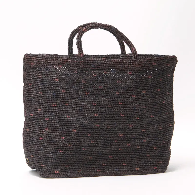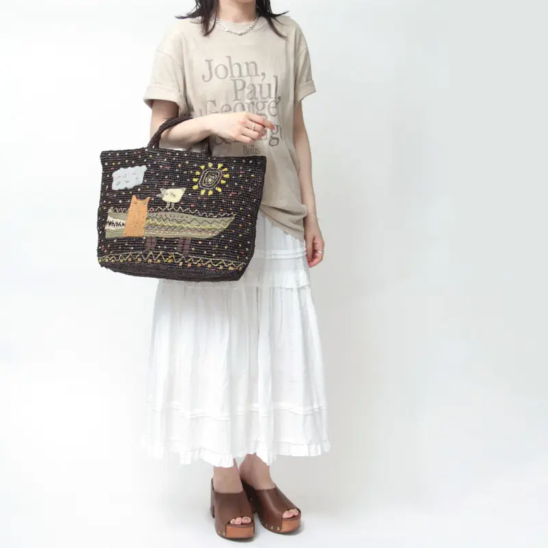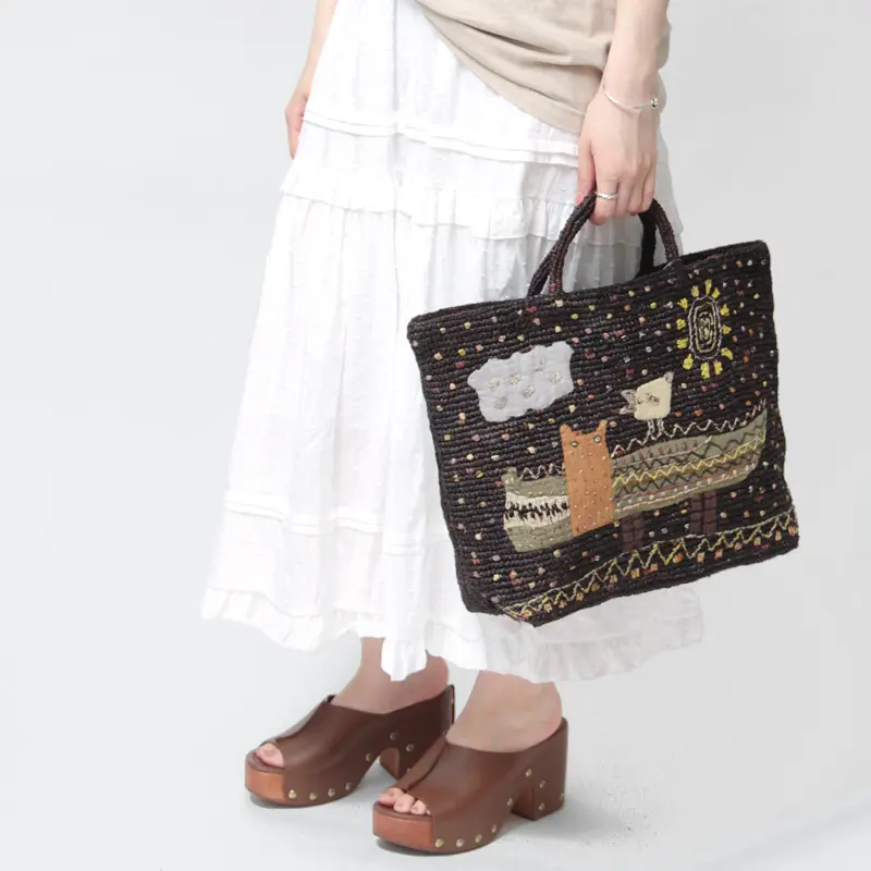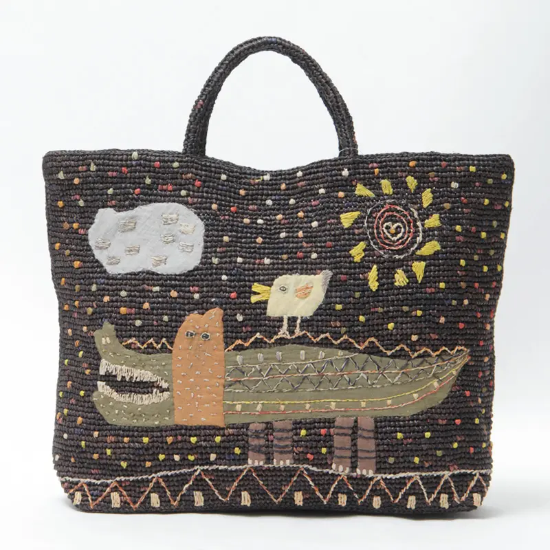 かぎ編みのラフィアに、鰐や鳥などをモチーフにした刺繍が映えるシンプルなトート型のラフィアバッグ。短めのハンドルは手持ちや腕掛けでバランスよく持てるデザインです。個性と遊び心が光るデザインは、大人の装いにこそ映えるもの。アートピースのような存在感で、日常のコーディネートをぐっと華やかに格上げしてくれます。