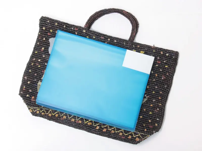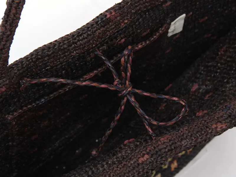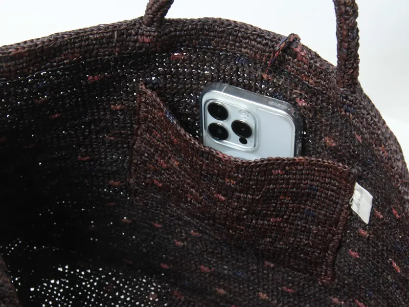 開閉はラフィアの紐を結ぶ仕様。A4サイズがゆったり収まるちょっと大きめのトートバッグ。長財布やポーチはもちろん、夏の必需品、折りたたみの日傘や飲み物も入れていただけます。内ポケット付きなので、スマホやICカードなどの小物も整理して収納できます。収納力がしっかりあるので、日常使いや通勤にもおすすめです。