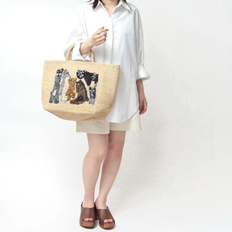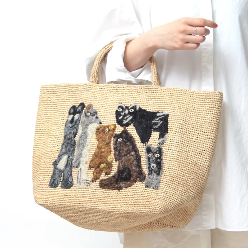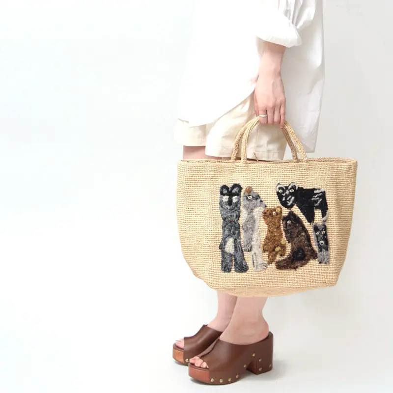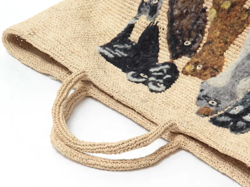 かぎ編みのラフィアに、ニードルフェルトで仕立てられた熊などの動物がふんわり優しい印象のトート型のカゴバッグ。短めのハンドルは手持ちや腕掛けでバランスよく持てるデザインです。個性と遊び心が光るデザインは、大人の装いにこそ映えるもの。アートピースのような存在感で、日常のコーディネートをぐっと華やかに格上げしてくれます。