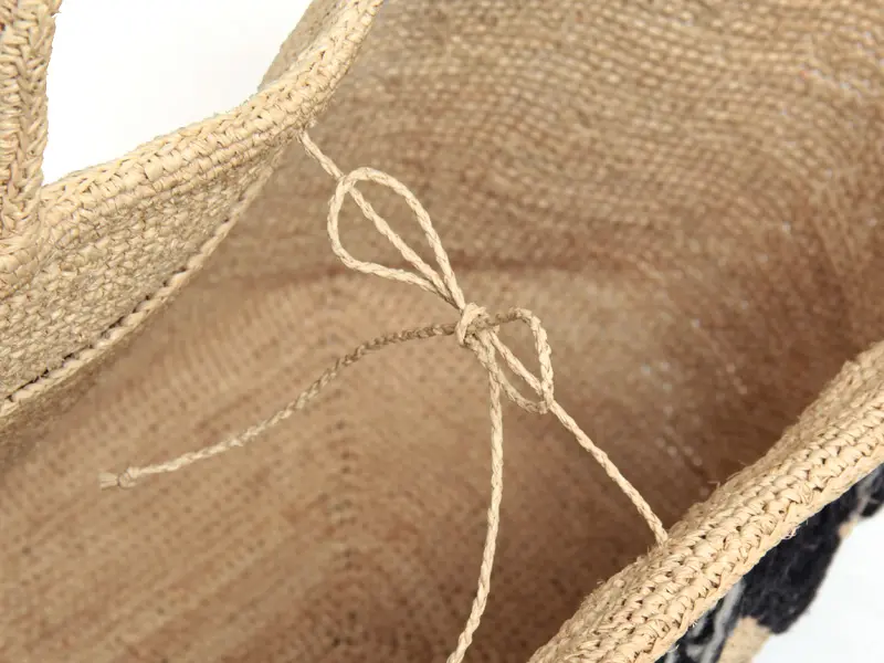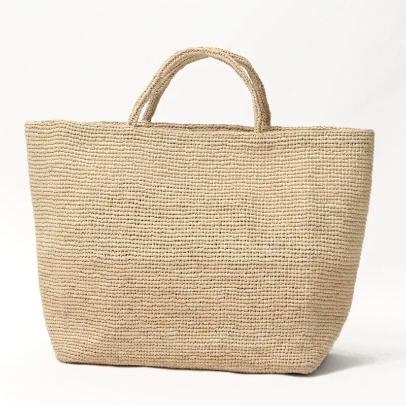 開閉はラフィアの紐を結ぶ仕様。A4サイズがゆったり収まるちょっと大きめのトートバッグ。長財布やポーチはもちろん、夏の必需品、折りたたみの日傘やペットボトルも収納可能です。内ポケット付きなので、スマホやICカードなどの小物も整理して収納できます。収納力がしっかりあるので、日常使いや通勤、お出かけにもおすすめです。