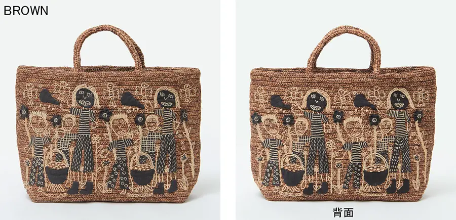 存在感のある刺繍も、ブラウンの本体に同系色で纏めることで、日常使いしやすい仕上がりに。装いにそっと華やぎを添えてくれます。刺繍は正面にも背面にも施されています。刺繍は手作業によるものなので、同じイラストでも正面背面によって少し違う表情を見せるのがこのバッグの魅力のひとつ。短めのハンドルは腕に掛けてもハンドで持っても、さっと持つだけで様になります。