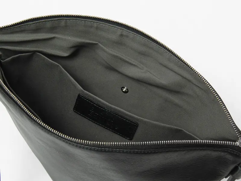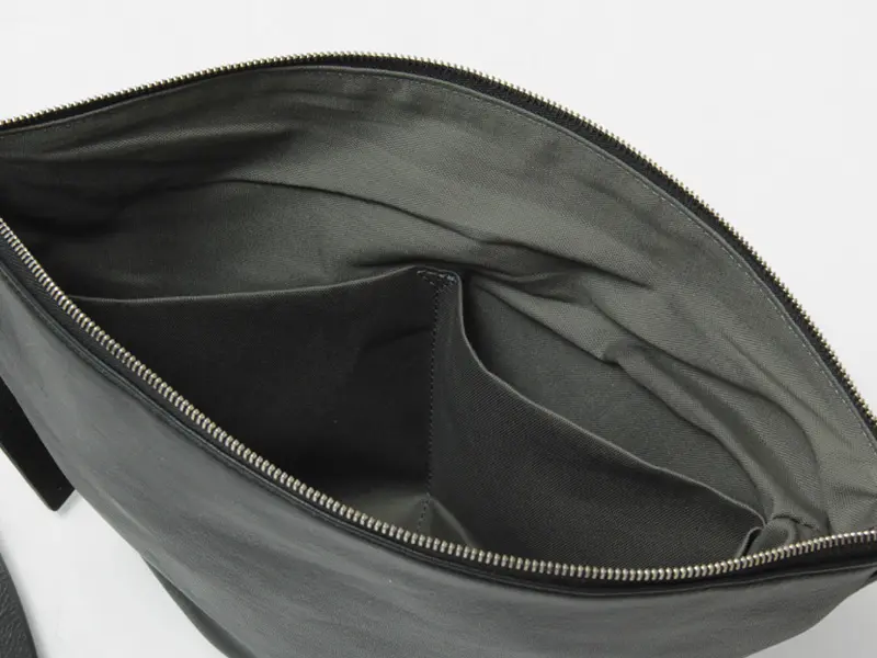 開閉はファスナー仕様。スリムな見た目ですが、見た目以上の収納力。長財布やスマホ、キーケースなど、毎日使う必需品がしっかり収まります。内側にはスナップボタン付きのポケットが1つ、オープンポケットが2つが付いており、小物を整理して収納できます。