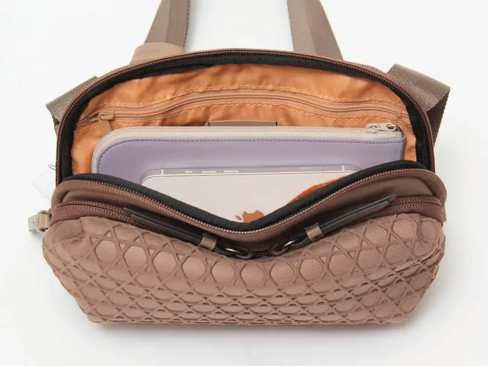 マチのある立体的なファスナーポケットと、背面のファスナーポケットの2層仕様。背面収納は長財布が収まるサイズ感で、スマホやエコバッグ、ハンカチなど必需品がしっかり収納可能。内ポケット付きで鍵などの小物も整理できます。
