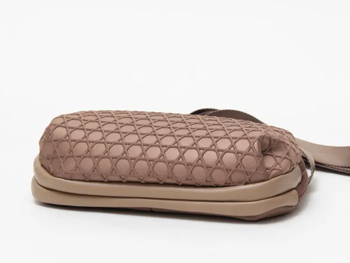 軽くて丈夫なポリウレタン素材にカゴメ柄を型押しした"LAQUOH /ラクーオ"の"篭目エンボスボンディング"シリーズ。エアリーな軽さとモチフワな手触り感のショルダーバッグは、ミニマルなデザインながら存在感のある面持ち。ショルダーベルトを短くしてボディバッグとしても使える2way仕様。撥水加工で急な雨でも安心です。