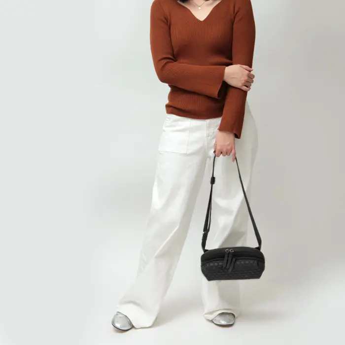 開閉はダブルファスナー仕様なので、左右どちらからでも開けやすいデザイン。ファスナーの留め位置を変えることで使い勝手や印象を自在にアレンジできます。