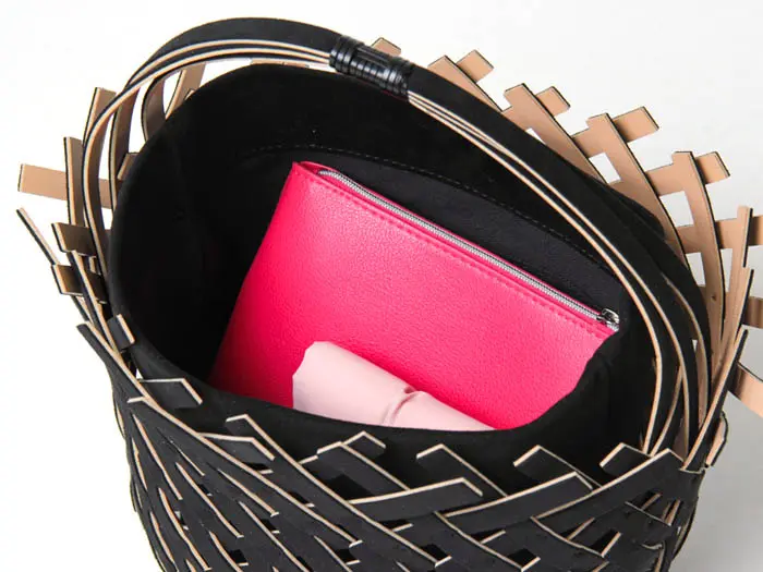 インナーバッグが付いているので、中身が見えずお財布などの貴重品を安心して収納できます。あえてインナーバッグなしでラフに持ってもお洒落です。裏面はスムースタイプの人工皮革を使用しており、汚れても水拭き可能です。