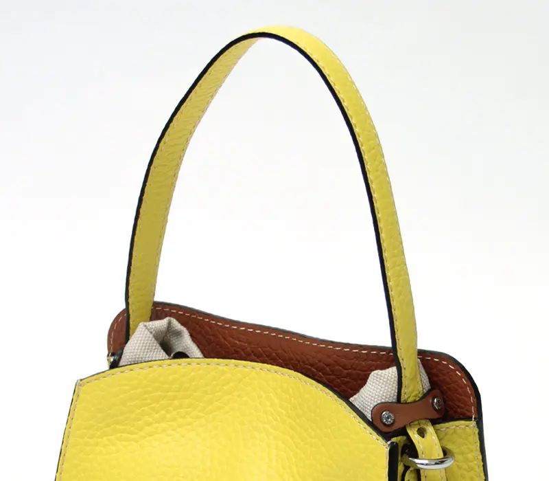 レディライクな印象を添える細身のレザーハンドルは、手に馴染む平手デザイン。手持ちや手首掛けにちょうど良い長さで、使いやすさにも配慮されています。ギボシ留めにより長さの調節が可能で、あえて長めに垂らせばアクセサリーのようなアクセントに。
