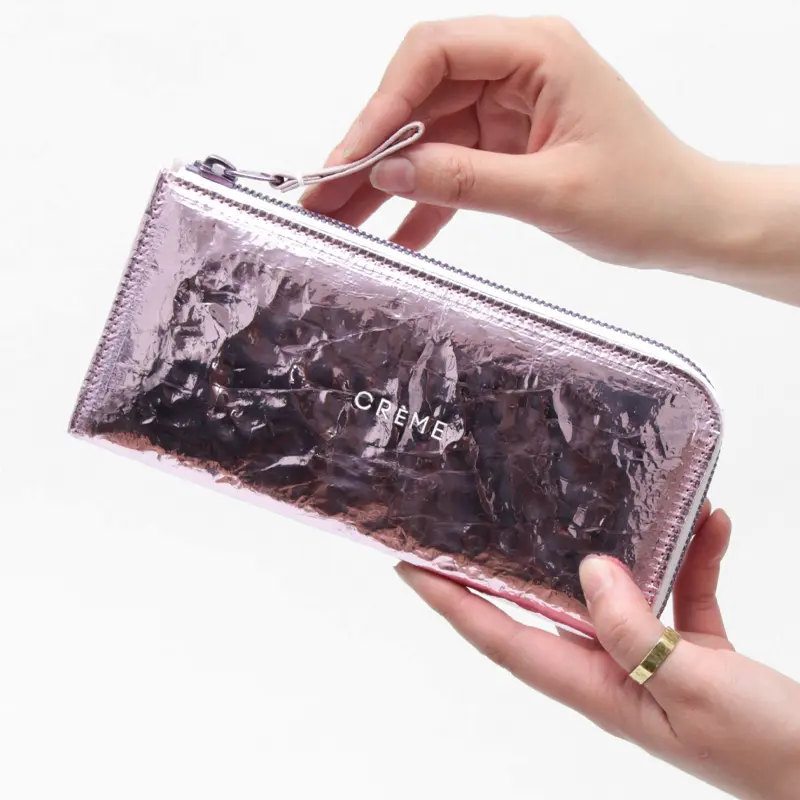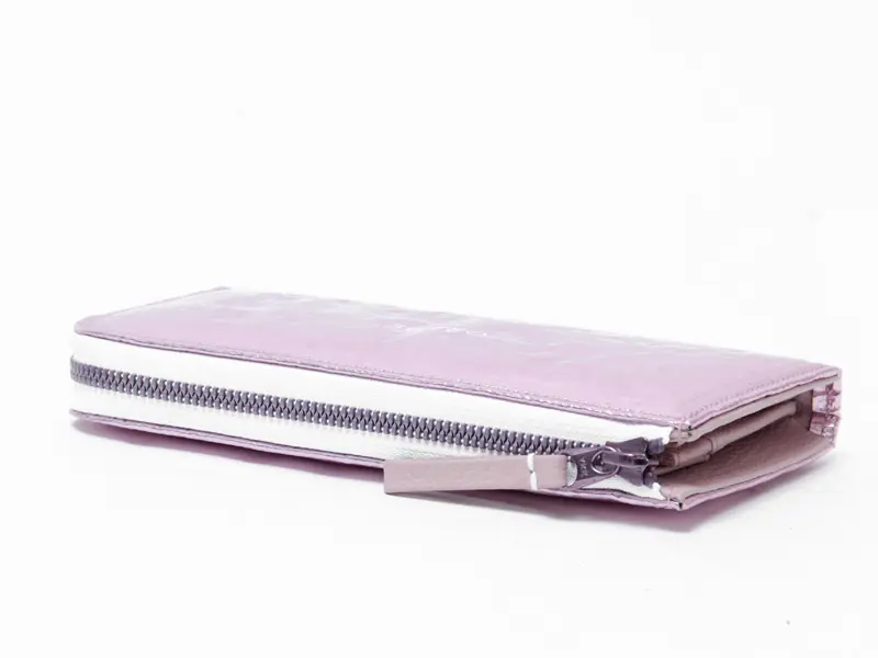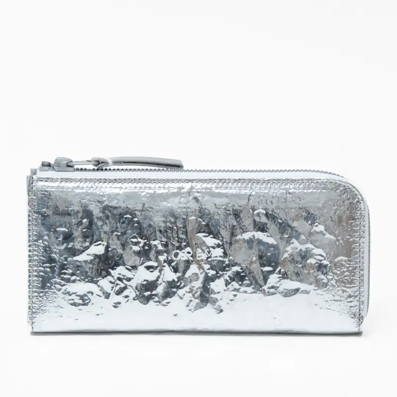 大手ハイブランドが取引するイタリアの素材メーカーが開発した素材(アルミにポリエステルコーティング)を使用したお財布。見た目の華やかさだけでなく、使い勝手の良さが魅力のL字ファスナー長財布で、収納力がありながらも機能的でスマートに持てる人気のデザインです。