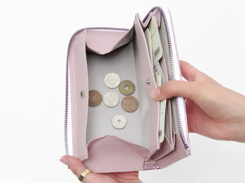 左側にはスナップボタン式のギャルソン風小銭入れを配置。ワンタッチで開閉でき、中身もひと目で見渡せます。