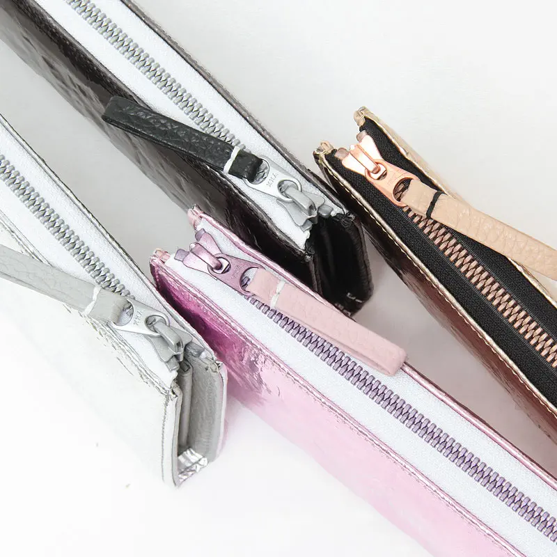 マ本体と同素材・同色のレザー引き手が生む一体感と、メタリック×カラーのコントラストが映えるファスナー。滑りのいい樹脂ファスナーを使用しているので、所作までエレガントに。細部まで美しさにこだわった、大人のための上質な仕上がりです。