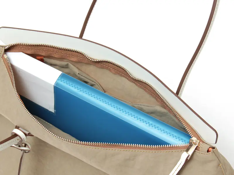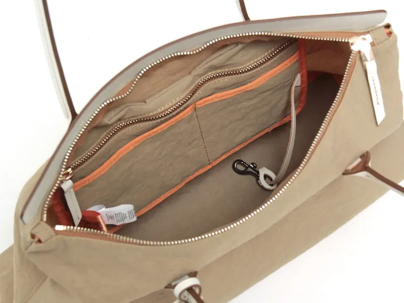 開閉はホワイトレザーのフラップ付きのファスナー仕様。