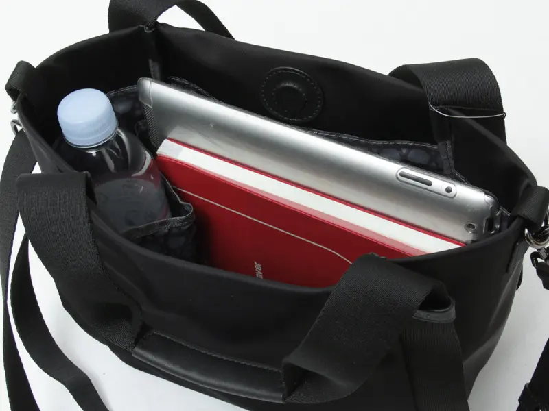 開閉はワンタッチで開くマグネット仕様で、荷物の出し入れもスムーズです。B5サイズや11インチのタブレットが収まる大きさ。内側にはドリンクポケットも備わっており、バッグの中で飲み物が倒れることもありません。お出かけから通勤まで日常に寄り添ってくれるバッグです。