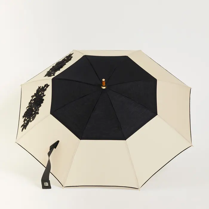 ツートーンのボディに立体的なアメリアレースがポイントとなった日傘。大人っぽい絞りのあるデザインにお花モチーフのレースがフェミニンさをプラス。きれいめコーデもカジュアルコーデもぐっと女性らしく上品に仕上げてくれます。お着物など和装とも好相性。日差しが気になる季節もオシャレしながらお出かけも快適です。