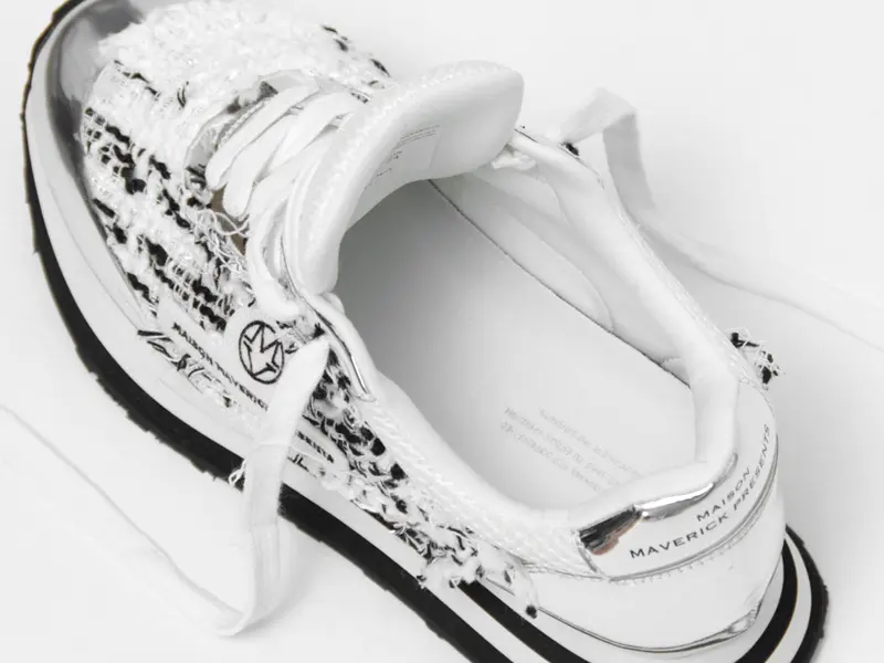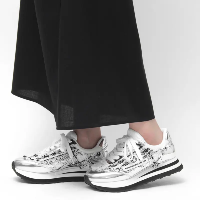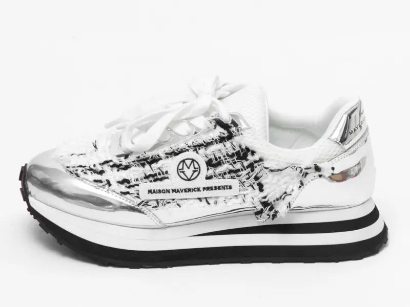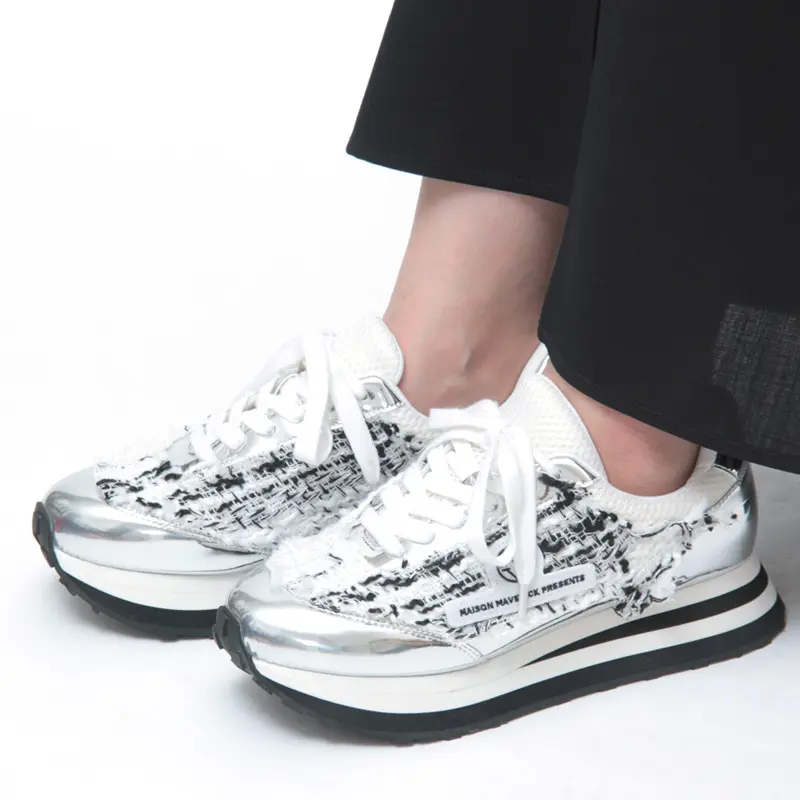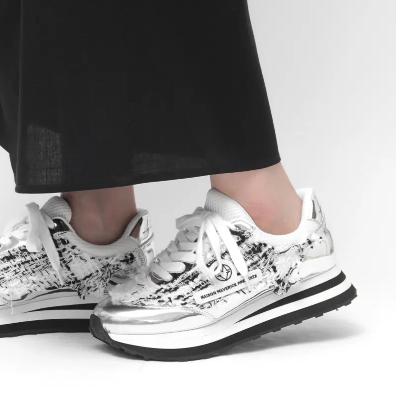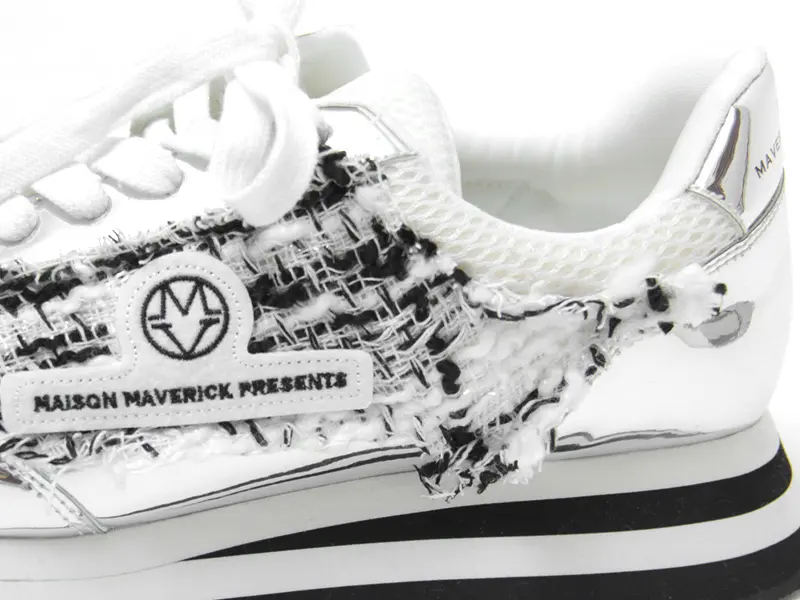 アッパーには粗目のツイード生地に、キリッと光るメタリックシルバーを絶妙に配置。異素材のコントラストが、奥行きのある表情とこなれた抜け感を演出します。サイドには「MAVERICK」ロゴワッペンがあしらわれています。