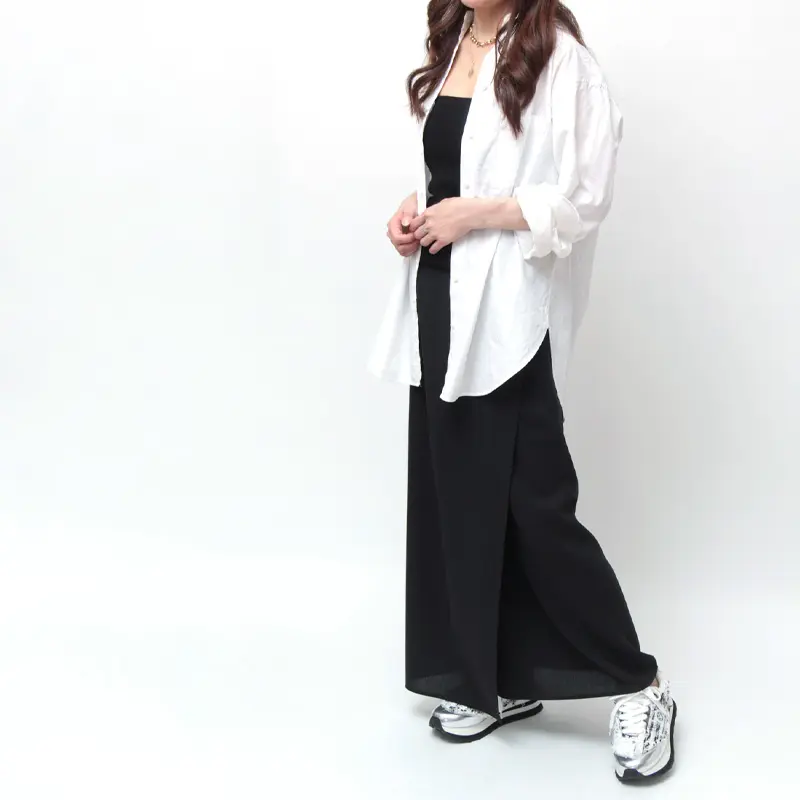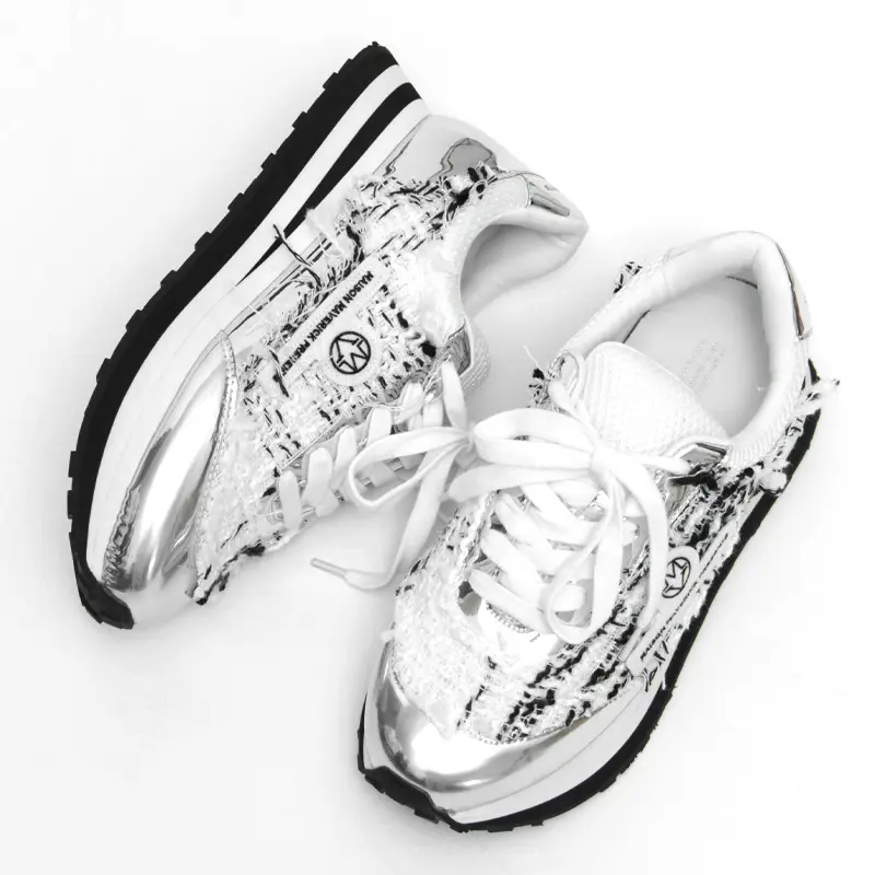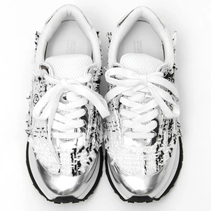 スポーティーに見えがちなダッドスニーカーを、繊細なツウィードの織り柄とワントーンでまとめ、女性らしく高級感のある印象に。 トレンド感あふれるY2Kルックにもフィットするボリューミーなシルエットとメタリックなアクセントが、足元に華やかさとエッジをプラス。 カジュアルスタイルはもちろん、キレイめなコーディネートの“はずし役”としても活躍し、履くだけで今のムードを纏える主役級スニーカーです。